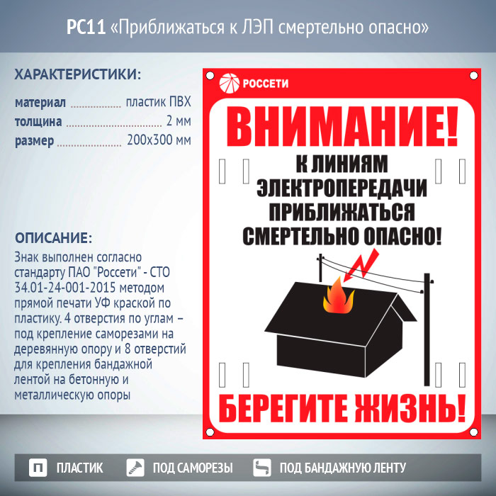 Знак «Приближаться к ЛЭП смертельно опасно», РС11 (пластик 2 мм, 200х300 мм, отверстия под бандажную ленту) в Улан-Удэ купить