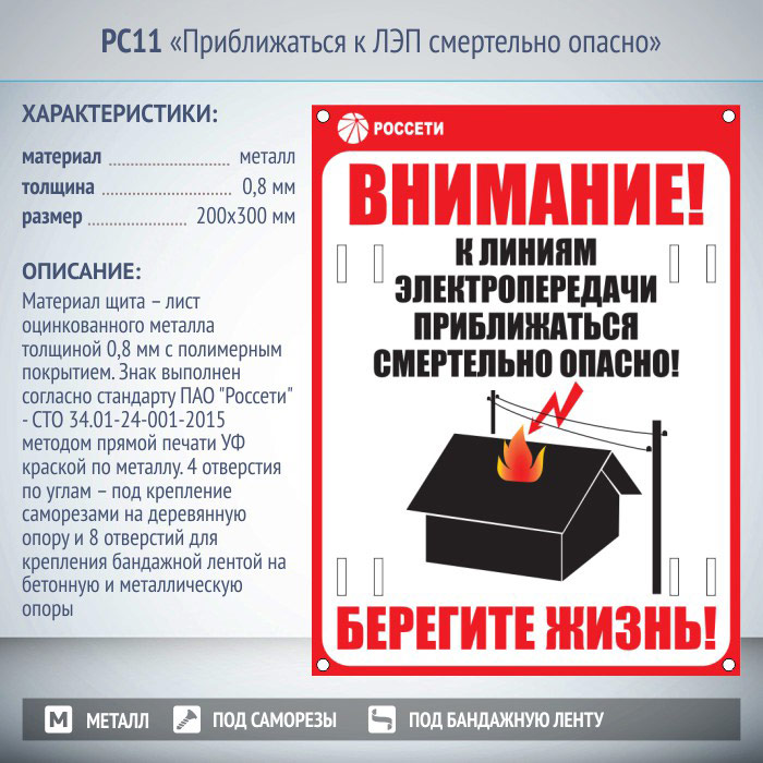 Знак «Приближаться к ЛЭП смертельно опасно», РС11 (металл, 200х300 мм, отверстия под бандажную ленту) в Улан-Удэ купить