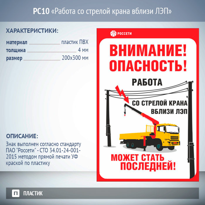 Знак «Работа со стрелой крана вблизи ЛЭП», РС10 (пластик 2 мм, 200х300 мм) в Улан-Удэ купить