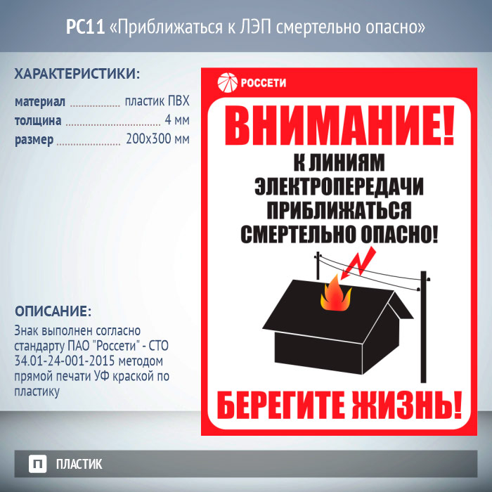 Знак «Приближаться к ЛЭП смертельно опасно», РС11 (пластик 2 мм, 200х300 мм) в Улан-Удэ купить