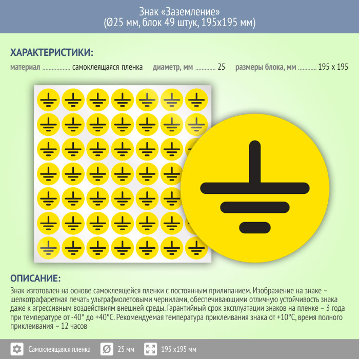 Знак (плакат) «Заземление», S46 (пленка, диаметр 25 мм, блок 49 штук, 195х195 мм) в Улан-Удэ купить