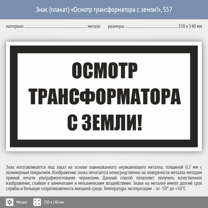 Знак (плакат) «Осмотр трансформатора с земли!», S57 (металл, 250х140 мм) в Улан-Удэ купить