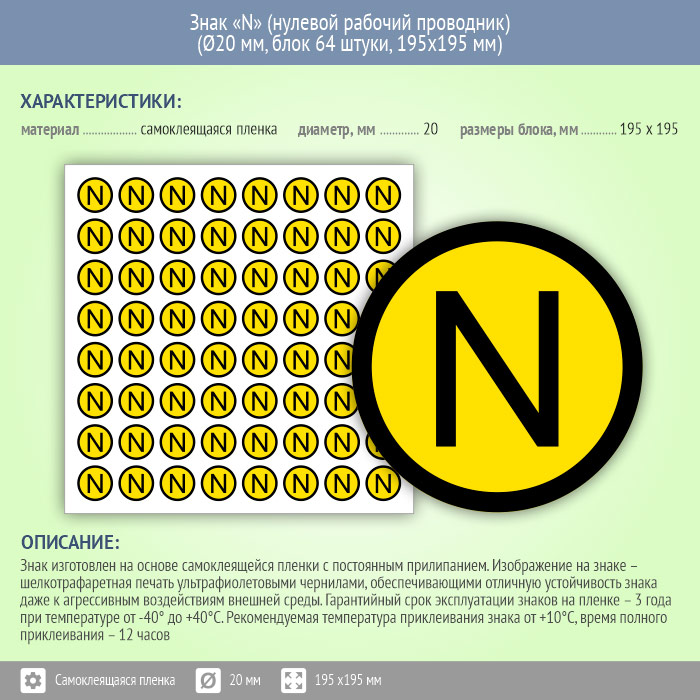 Знак (плакат) «N» (нулевой рабочий проводник), S47 (пленка, диаметр 20 мм, блок 64 штуки, 195х195 мм) в Улан-Удэ купить