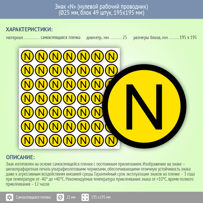 Знак (плакат) «N» (нулевой рабочий проводник), S47 (пленка, диаметр 25 мм, блок 49 штук, 195х195 мм) в Улан-Удэ купить