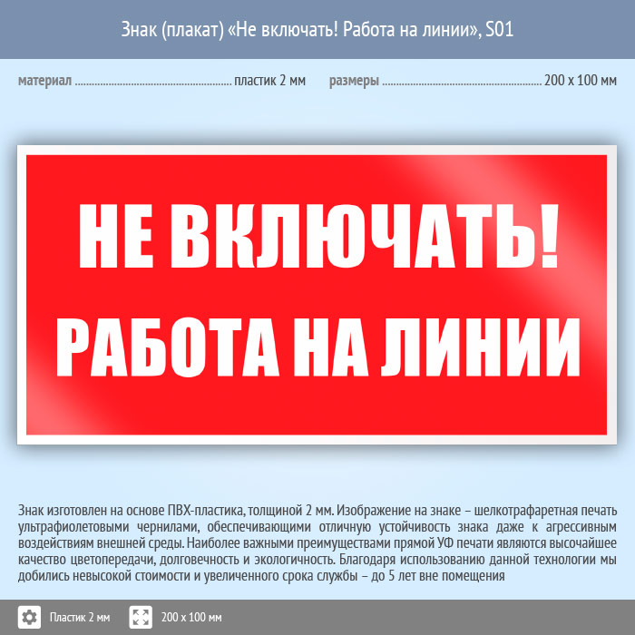Знак (плакат) «Не включать! Работа на линии», S01 (пластик, 200х100 мм) в Улан-Удэ купить