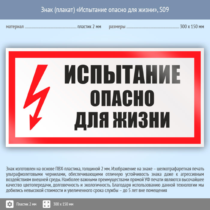Знак (плакат) «Испытание опасно для жизни», S09 (пластик, 300х150 мм) в Улан-Удэ купить