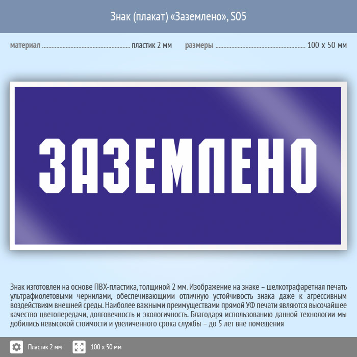 Знак (плакат) «Заземлено», S05 (пластик, 100х50 мм) в Улан-Удэ купить