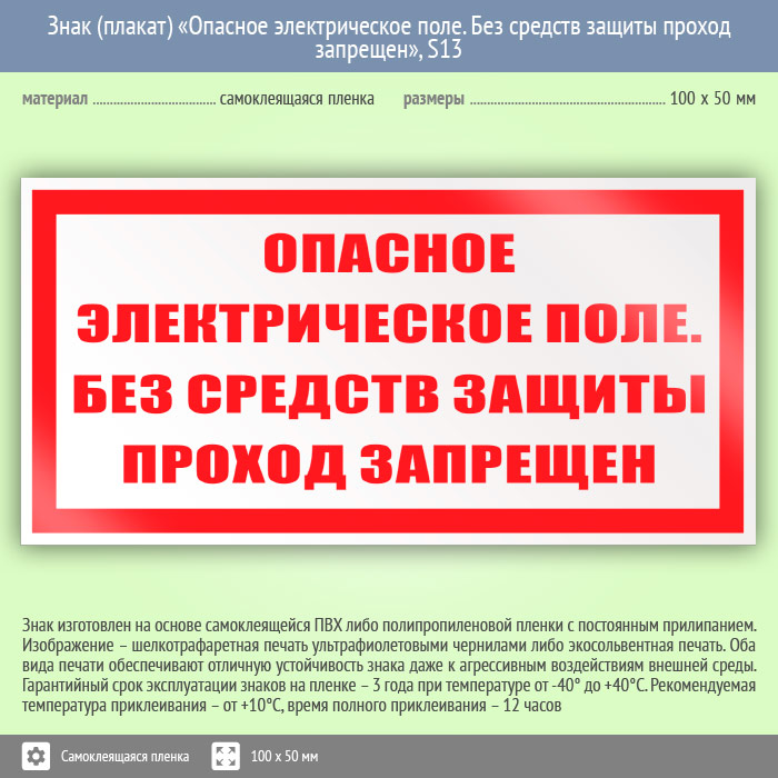 Знак (плакат) «Опасное электрическое поле. Без средств защиты проход запрещен», S13 (пленка, 100х50 мм) в Улан-Удэ купить