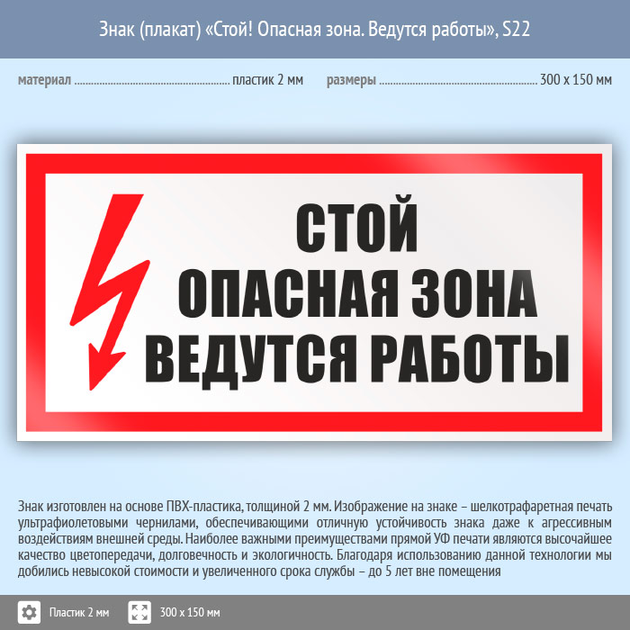 Знак (плакат) «Стой! Опасная зона. Ведутся работы», S22 (пластик, 300х150 мм) в Улан-Удэ купить