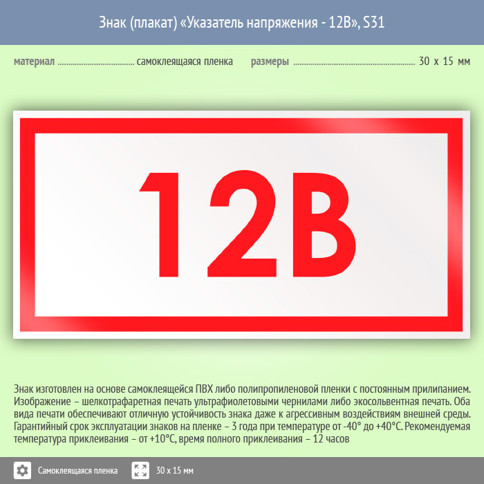 Знак (плакат) «Указатель напряжения 12 В», S31 (50 штук, пленка, 30х15 мм) в Улан-Удэ купить