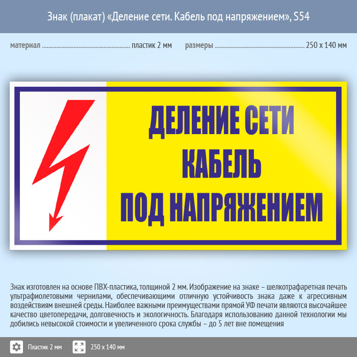 Знак (плакат) «Деление сети. Кабель под напряжением», S54 (пластик, 250х140 мм) в Улан-Удэ купить