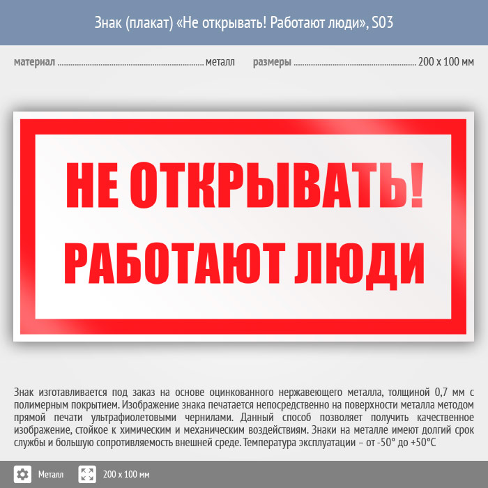 Знак (плакат) «Не открывать! Работают люди», S03 (металл, 200х100 мм) в Улан-Удэ купить