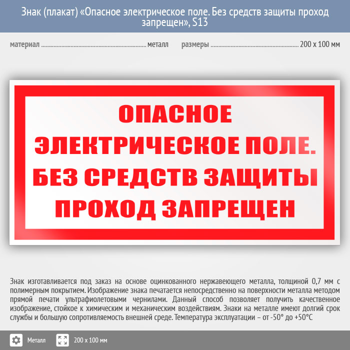 Знак (плакат) «Опасное электрическое поле. Без средств защиты проход запрещен», S13 (металл, 200х100 мм) в Улан-Удэ купить