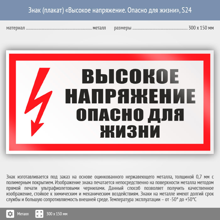 Знак (плакат) «Высокое напряжение. Опасно для жизни», S24 (металл, 300х150 мм) в Улан-Удэ купить