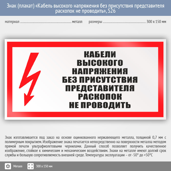 Знак (плакат) «Кабель высокого напряжения без присутствия представителя раскопок не проводить», S26 (металл, 300х150 мм) в Улан-Удэ купить