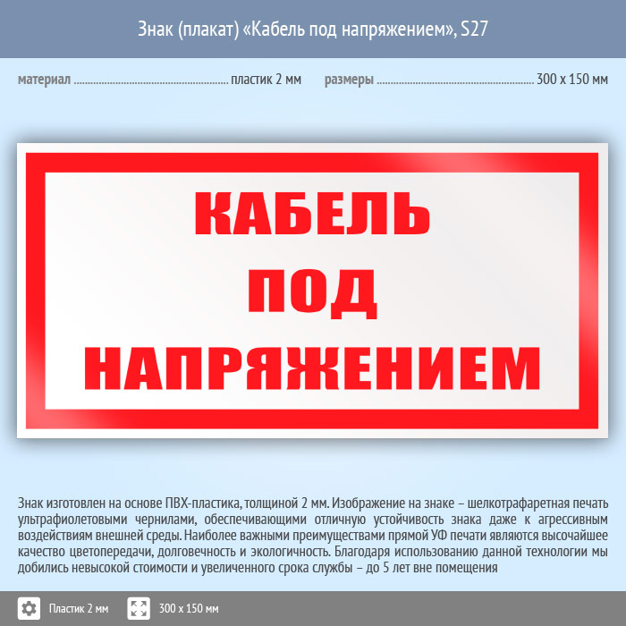 Знак (плакат) «Кабель под напряжением», S27 (пластик, 300х150 мм) в Улан-Удэ купить