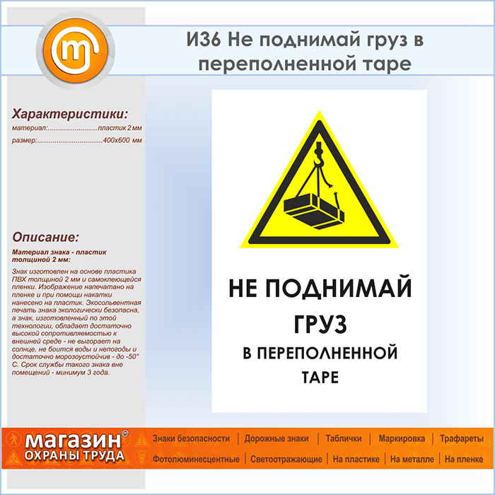 Знак «Не поднимай груз в переполненной таре», И36 (пластик, 400х600 мм) в Улан-Удэ купить