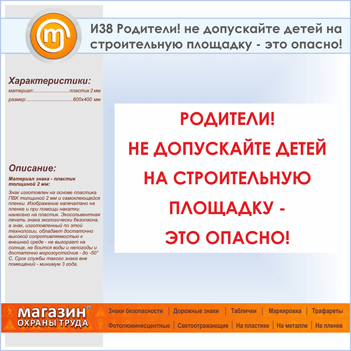 Знак «Родители! не допускайте детей на строительную площадку - это опасно!», И38 (пластик, 600х400 мм) в Улан-Удэ купить