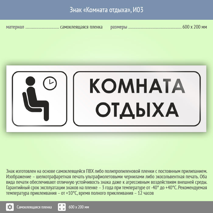 Знак «Комната отдыха», И03 (пленка, 600х200 мм) в Улан-Удэ купить