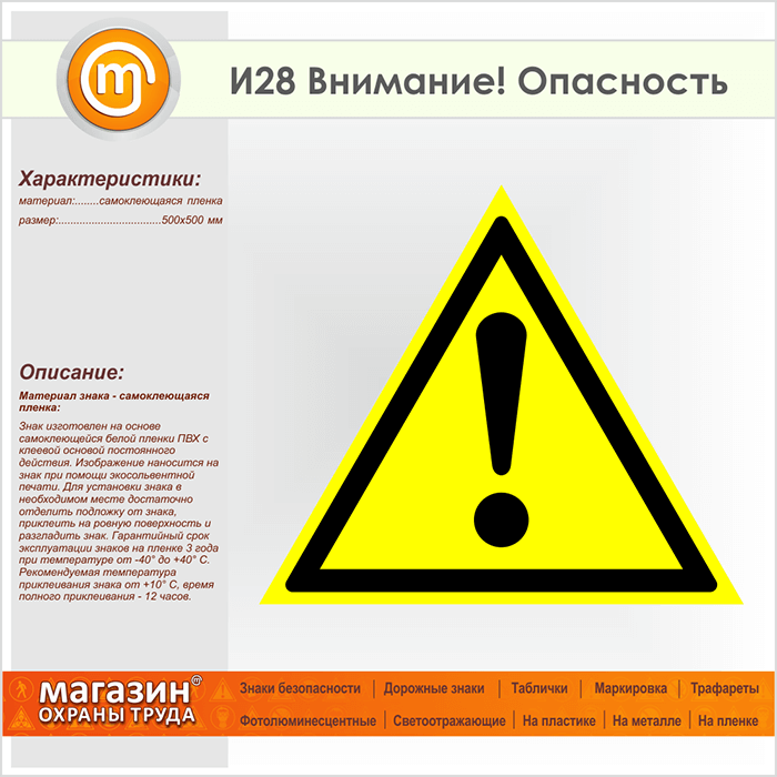 Знак «Внимание! Опасность», И28 (пленка, сторона 500 мм) в Улан-Удэ купить