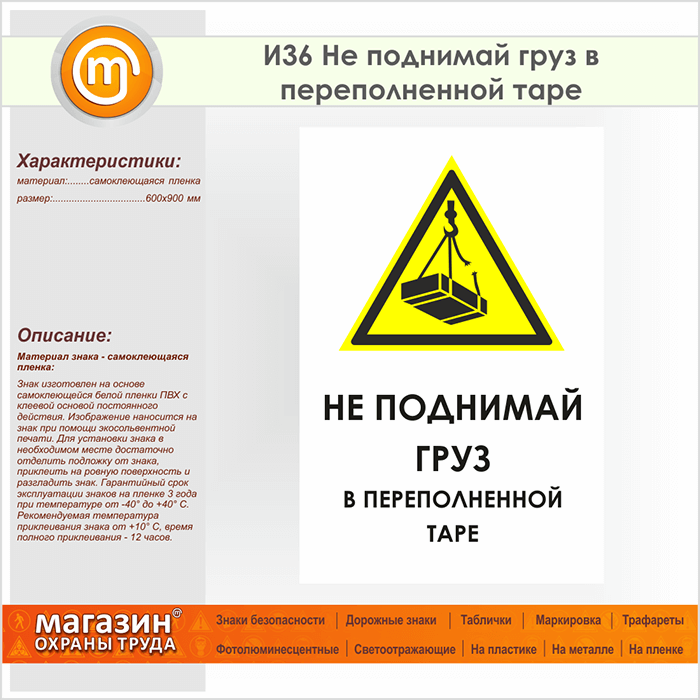 Знак «Не поднимай груз в переполненной таре», И36 (пленка, 600х900 мм) в Улан-Удэ купить
