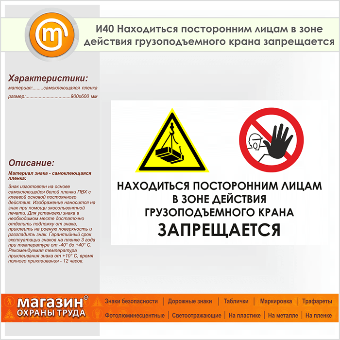 Знак «Находиться посторонним лицам в зоне действия грузоподъемного крана запрещается», И40 (пленка, 900х600 мм) в Улан-Удэ купить