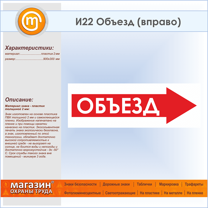 Знак «Объезд (вправо)», И22 (пластик, 900х300 мм) в Улан-Удэ купить