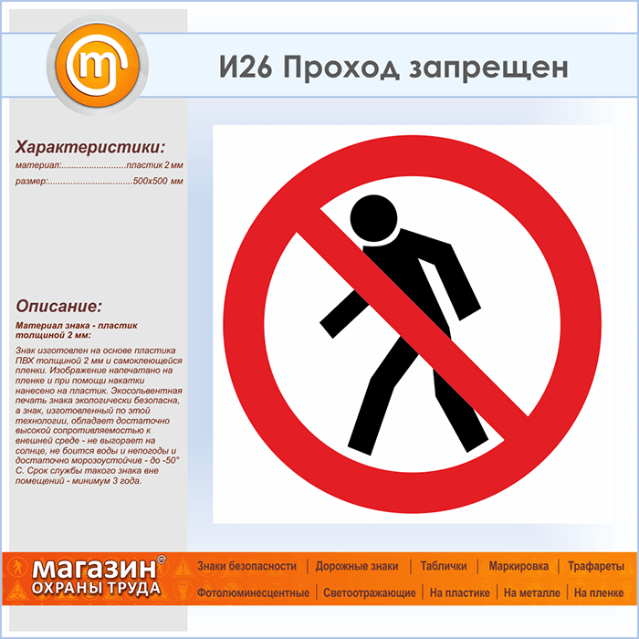 Знак «Проход запрещен», И26 (пластик, 500х500 мм) в Улан-Удэ купить