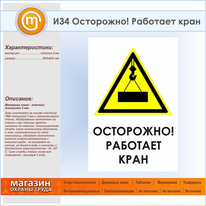 Знак «Осторожно! Работает кран», И34 (пластик, 600х900 мм) в Улан-Удэ купить