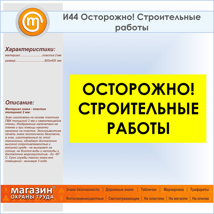 Знак «Осторожно! Строительные работы», И44 (пластик, 800х400 мм) в Улан-Удэ купить