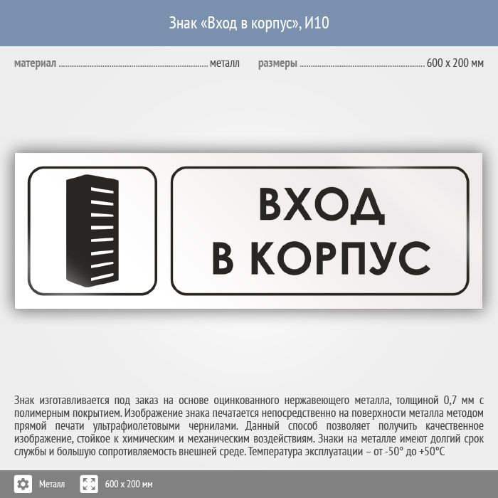Знак «Вход в корпус», И10 (металл, 600х200 мм) в Улан-Удэ купить