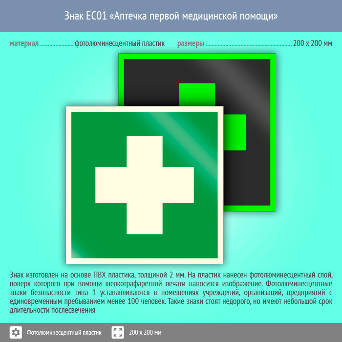 Знак EC01 «Аптечка первой медицинской помощи» (фотолюминесцентный пластик, 200х200 мм) в Улан-Удэ купить