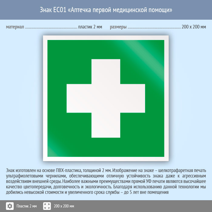 Знак EC01 «Аптечка первой медицинской помощи» (пластик, 200х200 мм) в Улан-Удэ купить