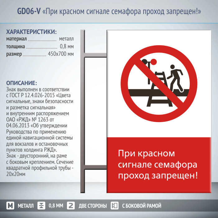 Знак «При красном сигнале семафора проход запрещен!», GD06-V (двусторонний вертикальный, 450х700 мм, металл, на раме с боковым креплением) в Улан-Удэ купить