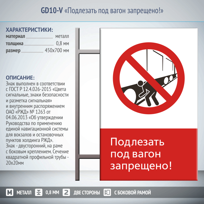 Знак «Подлезать под вагон запрещено!», GD10-V (двусторонний вертикальный, 450х700 мм, металл, на раме с боковым креплением) в Улан-Удэ купить
