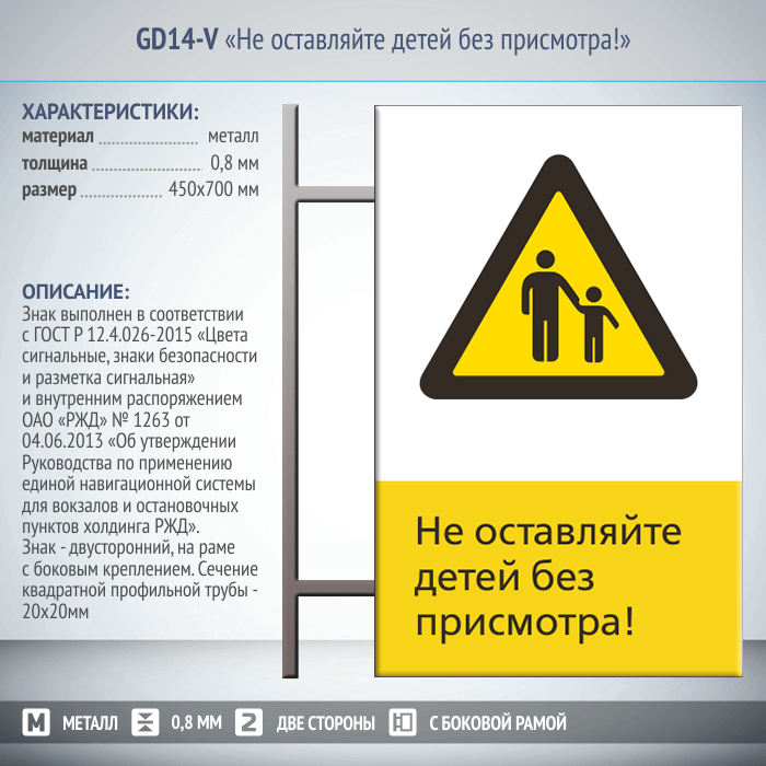 Знак «Не оставляйте детей без присмотра!», GD14-V (двусторонний вертикальный, 450х700 мм, металл, на раме с боковым креплением) в Улан-Удэ купить