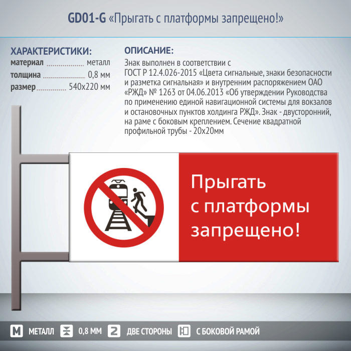 Знак «Прыгать с платформы запрещено!», GD01-G (двусторонний горизонтальный, 540х220 мм, металл, на раме с боковым креплением) в Улан-Удэ купить