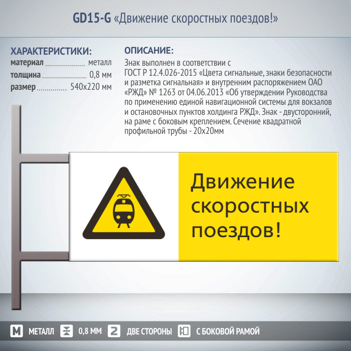 Знак «Движение скоростных поездов!», GD15-G (двусторонний горизонтальный, 540х220 мм, металл, на раме с боковым креплением) в Улан-Удэ купить