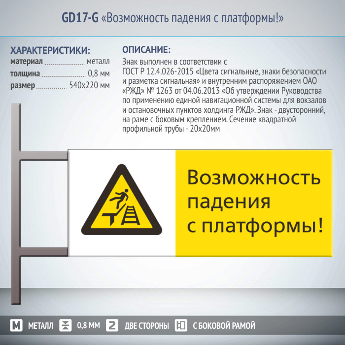 Знак «Возможность падения с платформы!», GD17-G (двусторонний горизонтальный, 540х220 мм, металл, на раме с боковым креплением) в Улан-Удэ купить