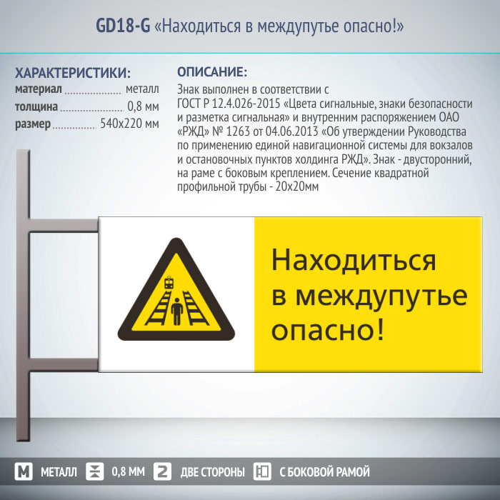 Знак «Находиться в междупутье опасно!», GD18-G (двусторонний горизонтальный, 540х220 мм, металл, на раме с боковым креплением) в Улан-Удэ купить