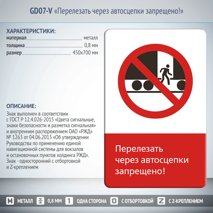 Знак «Перелезать через автосцепки запрещено!», GD07-V (односторонний вертикальный, 450х700 мм, металл, с отбортовкой и Z-креплением) в Улан-Удэ купить