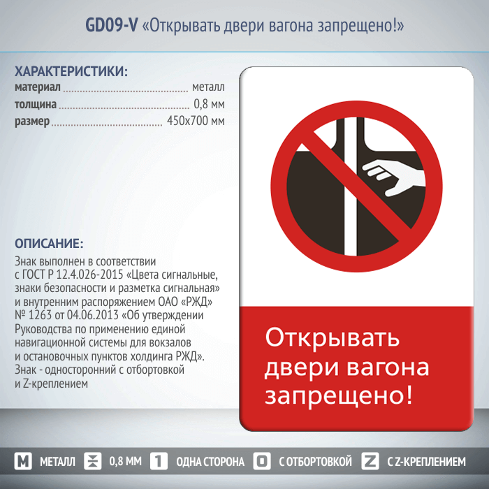 Знак «Открывать двери вагона запрещено!», GD09-V (односторонний вертикальный, 450х700 мм, металл, с отбортовкой и Z-креплением) в Улан-Удэ купить