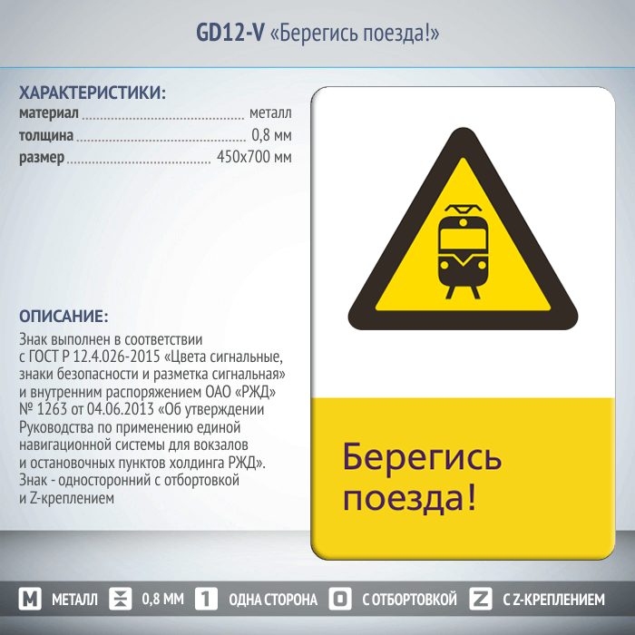 Знак «Берегись поезда!», GD12-V (односторонний вертикальный, 450х700 мм, металл, с отбортовкой и Z-креплением) в Улан-Удэ купить