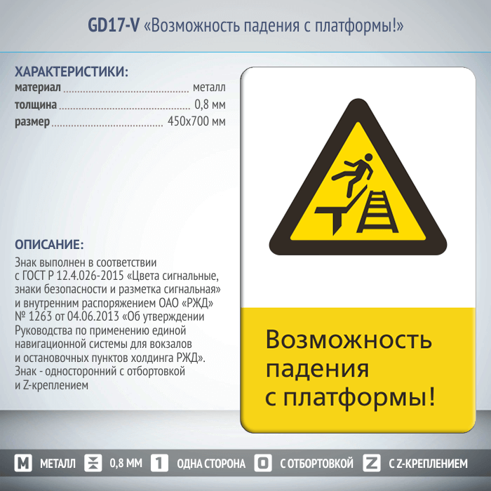 Знак «Возможность падения с платформы!», GD17-V (односторонний вертикальный, 450х700 мм, металл, с отбортовкой и Z-креплением) в Улан-Удэ купить