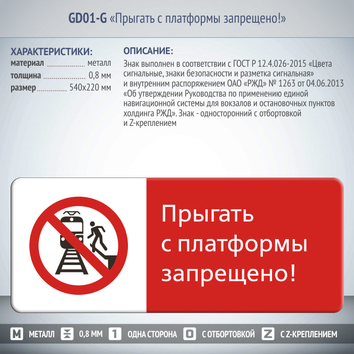 Знак «Прыгать с платформы запрещено!», GD01-G (односторонний горизонтальный, 540х220 мм, металл, с отбортовкой и Z-креплением) в Улан-Удэ купить