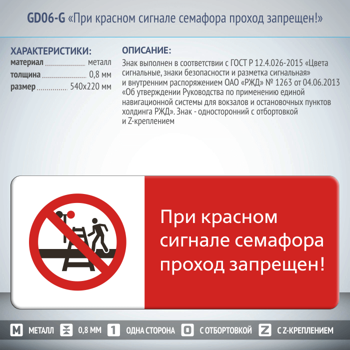 Знак «При красном сигнале семафора проход запрещен!», GD06-G (односторонний горизонтальный, 540х220 мм, металл, с отбортовкой и Z-креплением) в Улан-Удэ купить