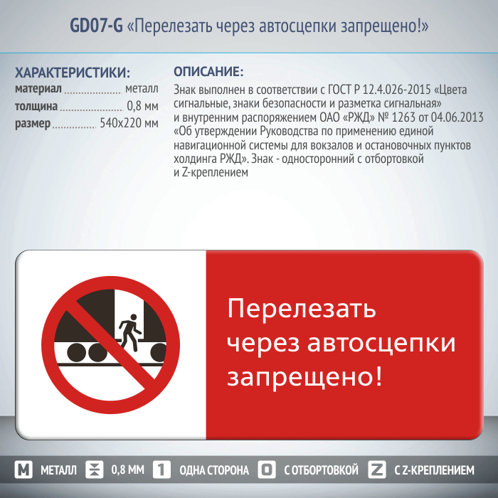 Знак «Перелезать через автосцепки запрещено!», GD07-G (односторонний горизонтальный, 540х220 мм, металл, с отбортовкой и Z-креплением) в Улан-Удэ купить