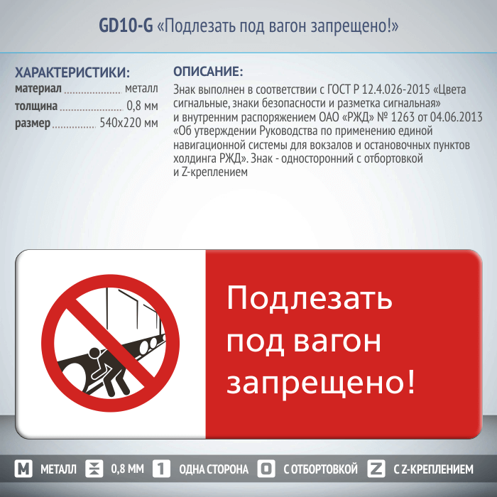 Знак «Подлезать под вагон запрещено!», GD10-G (односторонний горизонтальный, 540х220 мм, металл, с отбортовкой и Z-креплением) в Улан-Удэ купить