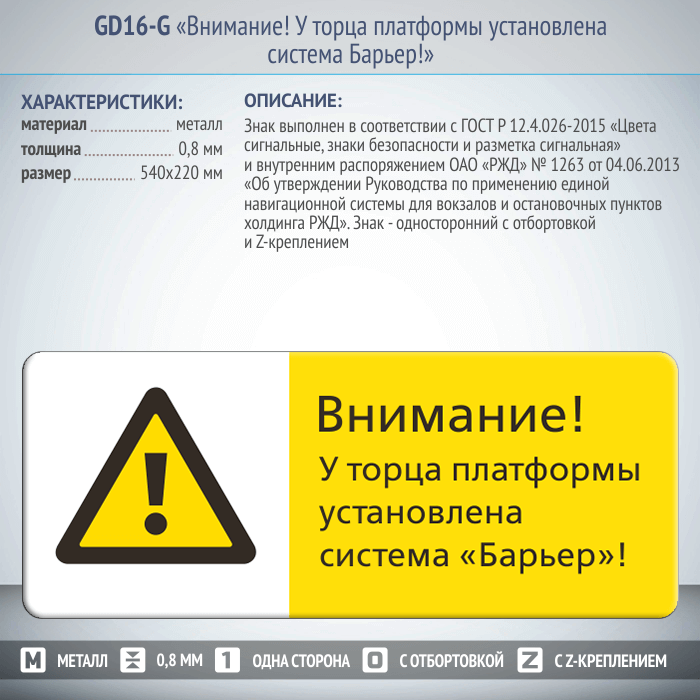 Знак «Внимание! У торца платформы установлена система Барьер!», GD16-G (односторонний горизонтальный, 540х220 мм, металл, с отбортовкой и Z-креплением) в Улан-Удэ купить