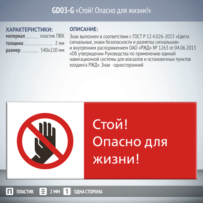 Знак «Стой! Опасно для жизни!», GD03-G (односторонний горизонтальный, 540х220 мм, пластик 2 мм) в Улан-Удэ купить